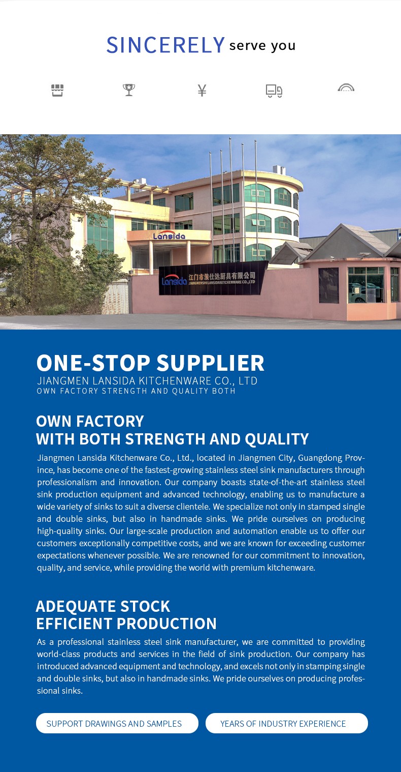 Jiangmen Lansida Kitchenware Co., Ltd was established in 2004 in Siqian Town, Xinhui District,Jianmen City, Guangdong Provice. Our company is specialized in manufacturing of high quality kitchen sink of different modern styles. We have gained good reputation on the market , as we were always focused on delivering high quality products. We pay extreme attention on providing our clients with only highiest quality products.